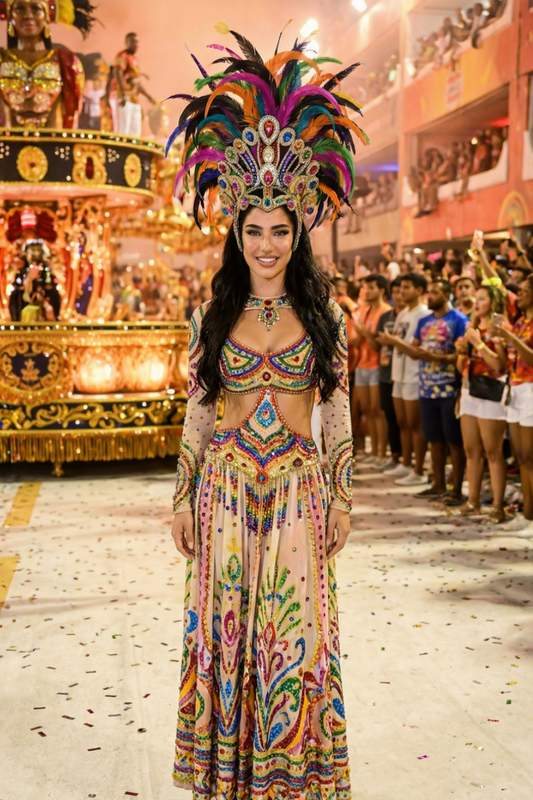 The main subject stands at the center of a lively carnival parade venue, with the scene set at night. She is wearing an extremely ornate and richly colored carnival costume, with a style that is distinctly characteristic of Brazilian Carnival and samba performances. She wears a tall feathered headdress composed of green, blue, purple, orange, and other vibrant colors, lavishly adorned with gemstones and gold embellishments, creating an exaggerated and eye-catching silhouette. Her upper body is dressed in a form-fitting decorative top made primarily of semi-transparent fabric and sequins. The chest, waist, and shoulders are covered with intricate multicolored embroidery, beadwork, and jeweled patterns. The cut is bold and theatrical, designed to emphasize a strong stage presence. Her lower body is dressed in a long skirt made of lightweight, flowing fabric, similarly embellished with symmetrical colorful patterns, sequins, and decorative lines. The skirt moves fluidly with her steps, adding a sense of motion and elegance. The background features a parade route surrounded by spectators, with colorful confetti scattered across the ground. In the distance, elaborately decorated floats and crowds of performers in costume can be faintly seen, without overpowering the main subject, keeping her clearly as the visual focus. The overall atmosphere is energetic and dazzling, filled with the festive spirit of celebration, music, and dance.