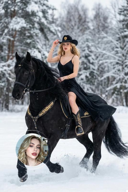 Recreate a new image based on the uploaded portrait image. This image presents a dramatic and visually striking winter snow scene in which rider and horse move as one. The overall atmosphere is mysterious, elegant, and filled with a sense of power. Subject: Rider and Horse The Rider: A graceful female rider sits astride the horse. She wears a black spaghetti-strap long dress, with the hem flowing dynamically as the horse runs, conveying both motion and elegance. On her head, she wears a black cowboy hat adorned with a gold emblem, slightly tilted to add a touch of Western flair and fashion-forward attitude. Her makeup is refined, and her gaze is confident and focused as she looks directly at the camera. Her right hand gently touches the brim of the hat, while her left arm hangs naturally, creating a composed yet expressive pose. She wears gold bracelets and earrings that contrast sharply with her black outfit, enhancing the overall sense of luxury. On her feet are black knee-high cowboy boots with gold embroidery, firmly positioned in the stirrups. The Horse: A powerful, well-built black horse, possibly a Friesian or a similar heavy breed. Its coat is glossy and deep black, while its mane and tail are thick, flowing, and full of vitality, flying freely in the snowy air. The tack (reins, saddle, and harness) is black, decorated with refined gold patterns and trim that echo the rider’s styling, giving the horse an elegant and noble appearance. The horse moves at a lively pace through the snow, lifting its front hooves and kicking up clouds of snow, emphasizing a strong sense of motion and energy. Environment & Atmosphere Background: The backdrop is a snow-covered forest, with tall, towering trees whose branches are heavily laden with snow, creating a quiet, cold winter atmosphere. Snowflakes drift gently through the air, adding a dreamy, poetic quality to the scene. Lighting & Color Tone: The black rider, horse, and equipment create a striking contrast against the white snow, making the subjects stand out clearly. Gold decorative details serve as visual highlights, adding warmth and a sense of luxury to the composition. The lighting is soft and diffused—likely from an overcast or snowy sky—resulting in rich layers and clearly visible details. Overall Impression This image blends Western cowboy culture, aristocratic fashion, and a natural snowy landscape. Through careful composition, coordinated styling, and dynamic motion capture, it creates a visual effect that is both wild and elegant, realistic yet dreamlike. The rider and horse form a harmonious and powerful symbiotic relationship, as if writing a legendary story of freedom, strength, and beauty across the cold winter plains.