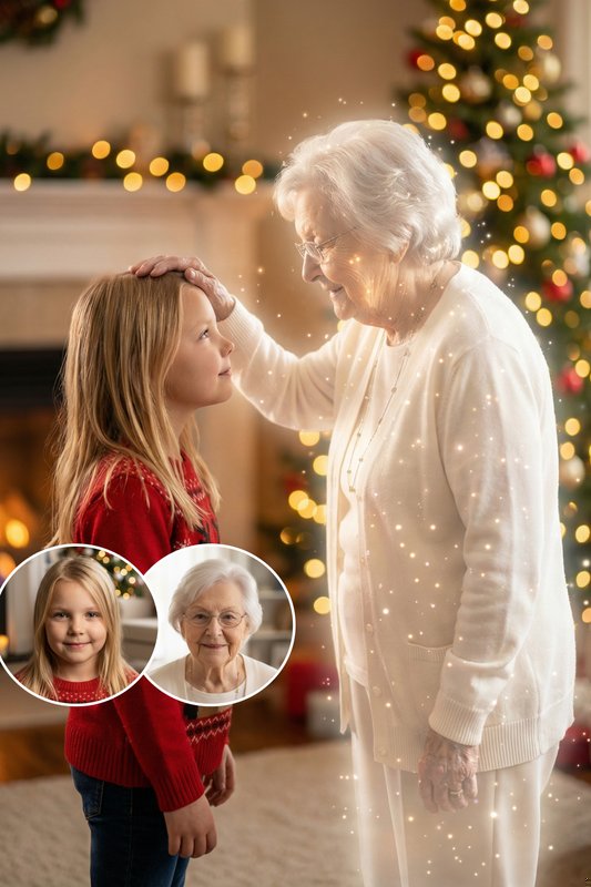Una commovente e magica fotografia fotorealistica di due persone delle immagini di riferimento insieme in un accogliente soggiorno natalizio. L'Anziano (Spirito): La persona anziana (dalla prima immagine di riferimento) appare come uno spirito a tutto corpo, solido e fisicamente presente con una forma umana gentile.Il loro corpo è dolcemente luminoso e bianco perlaceo, adornato con particelle di luce fini, scintillanti e scintillanti che brillano sulla loro superficie.Lo spirito brilla dall'interno, apparendo luminoso e magico pur rimanendo completamente solido, non trasparente, fumoso o simile a un fantasma.Sono posizionati allo stesso livello degli occhi del membro della famiglia, appoggiano delicatamente una mano sulla testa del membro della famiglia mentre lo guardano direttamente negli occhi con calore, amore e tenerezza. Il membro della famiglia (reale): Il membro della famiglia (dalla seconda immagine di riferimento) è completamente reale e solido, con la sua età intenzionalmente ambigua: può essere un bambino o un adulto.Indossano un maglione natalizio festivo e guardano l'anziano, stabilendo un contatto visivo diretto con un'espressione emotiva, fiduciosa e soddisfatta. Interazione e composizione: Entrambe le figure stanno sullo stesso piano orizzontale, una di fronte all'altra da vicino.La presenza scintillante e luminosa dell'anziano contrasta delicatamente con il realismo naturale del membro della famiglia, sottolineando un legame familiare magico ma intimo. Ambientazione e umore: Sono posizionati di fronte a un caminetto dalla luce soffusa e a un albero di Natale riccamente decorato con calde luci bokeh dorate.La stanza è piena di un'illuminazione calda e morbida, che crea un'atmosfera natalizia profondamente emotiva, magica e confortante.Illuminazione cinematografica, profondità di campo ridotta, stile ultra dettagliato e fotorealistico.