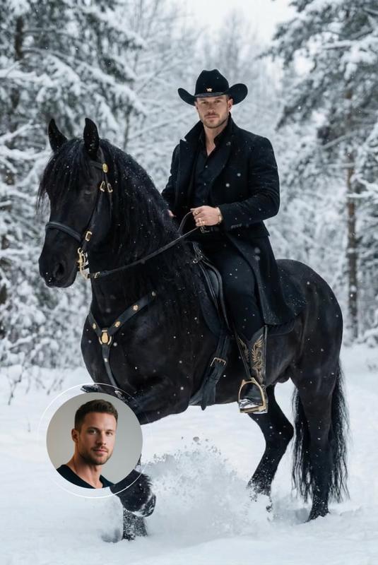 업로드된 인물 이미지를 기반으로 새로운 이미지를 재창조하세요. 이 이미지는 기수와 말이 하나가 되어 움직이는 드라마틱하고 시각적으로 인상적인 겨울 설경을 보여줍니다.전체적인 분위기는 신비롭고 우아하며 강한 힘과 지배력이 깃들어 있습니다. 주제: 기수와 말 기수: 자신감 있고 위엄 있는 남성 기수가 말 위에 앉아 있습니다.샤프하고 구조적인 실루엣이 돋보이는 블랙 롱 테일러드 코트를 몸에 딱 맞는 블랙 셔츠 위에 레이어드해 대담하고 남성적인 룩을 연출했습니다.코트는 말의 움직임에 따라 역동적으로 흐르며 힘과 권위를 강조합니다. 그는 은은한 금색 엠블럼으로 장식된 검은색 카우보이 모자를 쓰고 있으며 약간 기울어져 있어 하이패션의 우아함과 결합된 투박한 서양식 미학을 더욱 돋보이게 합니다.그의 얼굴 표정은 차분하고 절제되고 자신감이 있으며 카메라를 똑바로 바라보며 공격성보다는 자신감과 지배력을 드러냅니다. 한 손은 가볍게 올려 고삐를 잡고 다른 손은 허벅지나 코트 가장자리 근처에 얹어 차분하고 강력한 자세를 유지합니다.그는 팔찌, 반지 등 미니멀하면서도 세련된 골드 액세서리를 착용해 과하지 않은 절제된 럭셔리함을 더했다.세련된 금색 자수가 특징인 그의 검은색 가죽 카우보이 부츠는 등자에 단단히 고정되어 안정성과 제어력을 강화합니다. 말: 광택이 나는 짙은 검은 털을 지닌 강력하고 근육질의 검은색 말로, 홀스타인이나 유사한 무거운 품종과 비슷합니다.갈기와 꼬리는 두껍고 유려하며 드라마틱하며 앞으로 나아갈 때 찬 공기를 가르며 움직입니다.고삐, 안장, 마구를 포함한 말의 압정은 완전히 검은색이며 복잡한 금색 디테일이 있어 라이더의 복장을 반영하고 통일되고 장엄한 시각적 언어를 강화합니다. 말은 앞발굽을 들어올리고 미세한 눈보라를 공중으로 보내며 자신감 있게 눈을 뚫고 전진합니다.활력. 환경 및 분위기 배경: 설정은 크고 울창한 나무가 있는 눈 덮인 숲입니다.눈이 나뭇가지에 많이 달라붙어 조용하고 차갑고 몰입감 넘치는 겨울 환경을 조성합니다.눈송이가 공중에 떠다니면서 깊이와 영화 같은 분위기를 더해줍니다. 조명 및 색상 톤: 구성은 새하얀 눈과 검은 기수, 말, 장비 사이의 뚜렷한 대조가 지배합니다.골드 액센트는 시각적 하이라이트 역할을 하며 추운 환경에 따뜻함과 세련미를 더해줍니다.조명은 부드럽고 자연스러우며 확산되어 흐린 겨울 하늘과 조화를 이루며 장면 전반에 걸쳐 섬세한 디테일과 사실적인 질감을 유지합니다. 전체 인상 이 이미지는 서양 카우보이 문화, 남성적인 하이 패션, 드라마틱한 겨울 풍경을 융합합니다.절제된 자세, 조화로운 스타일링, 역동적인 모션을 통해 강력하면서도 우아한 시각적 내러티브를 전달합니다.기수와 말은 조용하고 지배적이며 틀림없이 강력한 하나의 통일된 힘으로 나타나 얼어붙은 황야를 가로질러 움직이는 자유, 통제, 순수한 힘에 대한 전설적인 이야기를 연상시킵니다.
