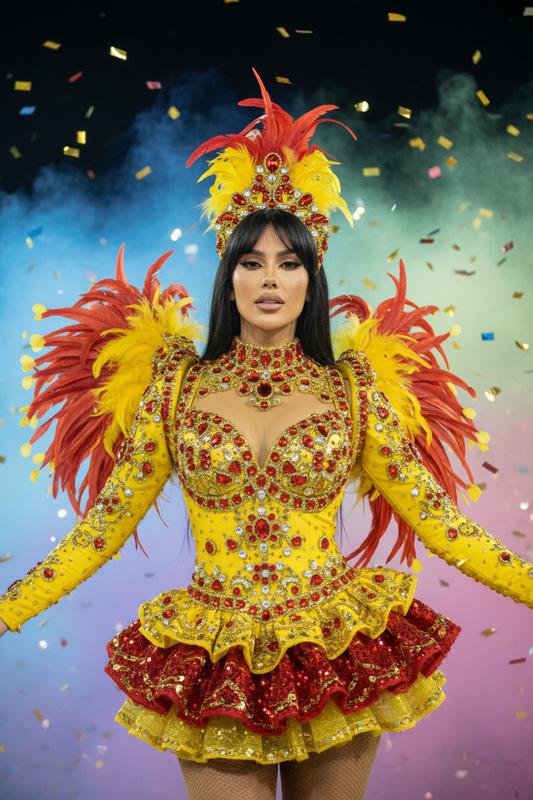 Generate a photo based on the character in the uploaded image. The subject is wearing a Brazilian Carnival samba dress characterized by a short skirt, layered ruffles, and embellishments with sequins and gemstones. The upper body features a fully covered, form-fitting design with a relatively high neckline and a sweetheart-shaped collar, incorporating inner lining or mesh to conceal the chest. The fit is close to the body but not revealing. The lower body consists of a multi-layered ruffled short skirt, creating an overall look that is ornate, lively, and suitable for stage performances and festive parades. The costume’s main color palette is yellow accented with red, decorated with sequins or diamond-like details. Feather adornments are placed in her hair, and large feathered wings extend from her back. She wears refined, elegant makeup. The scene takes place on the stage of the Rio de Janeiro Carnival, captured in a close-up shot framed from above the calves upward. The subject faces the camera directly, looking confidently into the lens, and the photo is taken at night. The background is filled with colorful smoke and floating confetti, highlighting the main subject, who is positioned at the center of the frame. Key point: The outfit must remain modest, with no visible cleavage or large areas of exposed skin; the top fully covers and encloses the entire upper body.