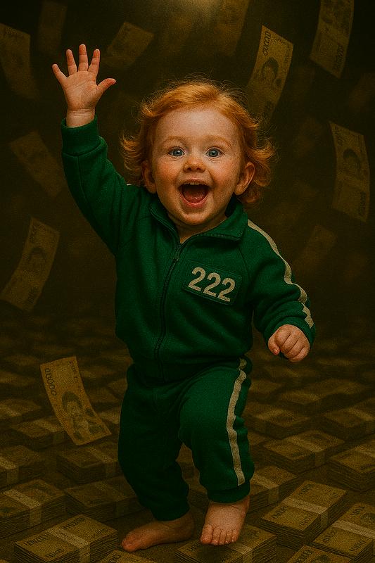 Het karakter verandert snel, en het karakter verandert en verandert snel in een baby van ongeveer twee dagen oud. De gelijkenis van het personage is erg hoog. Hij springt opgewonden en is erg blij. Overal om hem heen liggen stapels bankbiljetten uit de Koreaanse won (₩), en de Koreaanse won valt uit de lucht. De baby draagt groene sportkleding met witte strepen en een nummer 222 op zijn hoofd. borst. Er is een felle spotlight boven de scène en de bankbiljetten schijnen subtiel onder het licht, waardoor dramatische spanning ontstaat. De uitdrukking van het kind is opgewonden en trots, en hij is vol verrassing als hij een enorme hoeveelheid geld. De achtergrond is rijk en benadrukt het contrast en de emotionele sfeer tussen het personage en de stapel geld. De algehele beeldtextuur is op Koreaans dramafilmniveau, met echte textuur en een lichte filmkorrel.