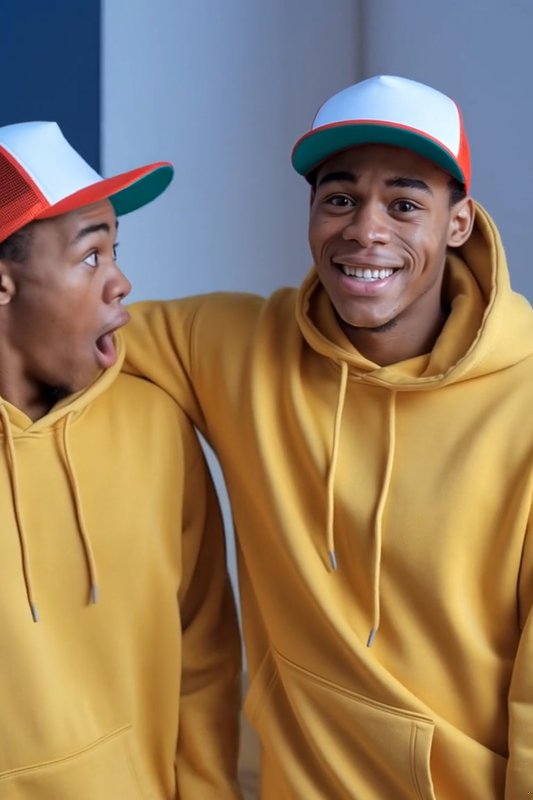 The protagonist in the picture is facing the camera confidently. A person who looks exactly like the protagonist appears from the side of the picture. He wears the same clothes, hairstyle and looks the same as the protagonist. His hand is around the protagonist's shoulder. The protagonist looks at him in shock. The atmosphere is humorous and dramatic.
