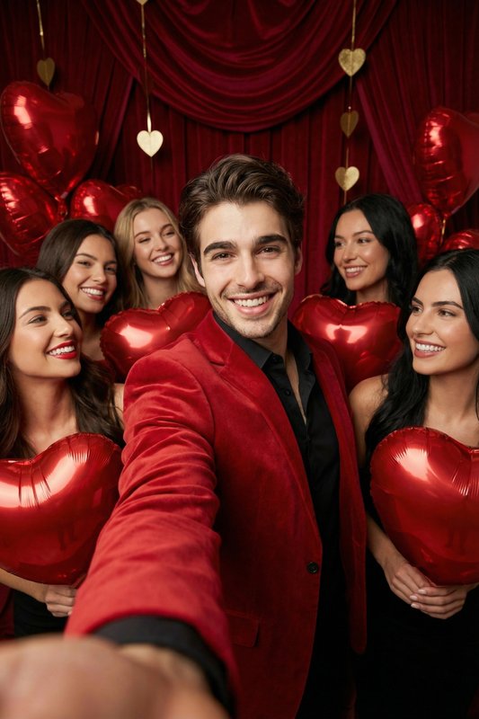 根据上传图像中的主题重新创建新图像。该构图是一幅以情人节为主题的垂直集体肖像,以中近距离、略广角的视角拍摄。该图像传达了强烈的亲密感和参与感,类似于自拍照。主要用户位于画面正中央,占据最前面的前景,一只手臂自然向前伸展,清晰地建立了第一人称自拍视角。手机本身不可见,用户成为图像绝对唯一的视觉核心。 用户直接面向摄像头,身体略微前倾,姿势轻松自然。他们的表情明亮、自信、情感丰富,散发着强烈的存在感。用户穿着情人节主题的服装,例如红色或暖色调的连衣裙或时尚前卫的服装,材质精致,剪裁合身。整体造型强调节日气氛和强烈的中心人物感。 多个异性成员围绕着用户,位于中景和背景,形成圆形或半封闭的构图。周围个体的数量足以创造密度而不显得混乱。它们排列成半圆形结构,自然地将视觉焦点引向中心的用户。他们的姿势具有凝聚力,身体面向用户和相机。他们的表情友好而快乐,明显地营造出一种支持、钦佩的氛围,强化了用户的核心角色和社会吸引力。 周围的人手中或面前拿着红色心形气球。气球是完整的、三维的,具有光泽或金属表面和清晰的高光。它们作为情人节的关键符号反复出现,增强了图像的节日特征和视觉节奏。一些心形气球放置在前景或中景,营造出层次感和丰富的空间构图感。 背景是室内情人节主题布景,以深红色窗帘或垂褶织物为基础。上方或中央背景布置悬挂的金色或红色心形装饰,在视觉上与心形气球相呼应。背景灯光柔和,细节略显模糊,旨在突出前景人物和心脏元素,同时不会分散对主要拍摄对象的注意力。 灯光采用柔和的工作室人像设置。主光集中在画面中央区域,确保用户的脸部和服装最亮、最清晰。周围的人物受到的照明略有减弱,但仍然足够,在主要拍摄对象和配角之间形成自然的层次结构。整体色调以红色、金色、暖色调为主,营造出热情、浪漫的氛围,带有浓郁的情人节派对氛围。 整体风格融合了高端时尚摄影与社交、喜庆的氛围。它强调用户作为中心人物的角色,被包围和欣赏的感觉,以及节日的情人节气氛。该图像具有强烈的视觉冲击力、沉浸感以及精致、优质的美感。